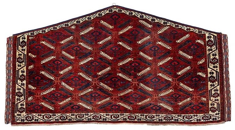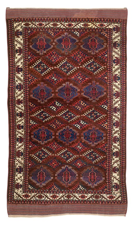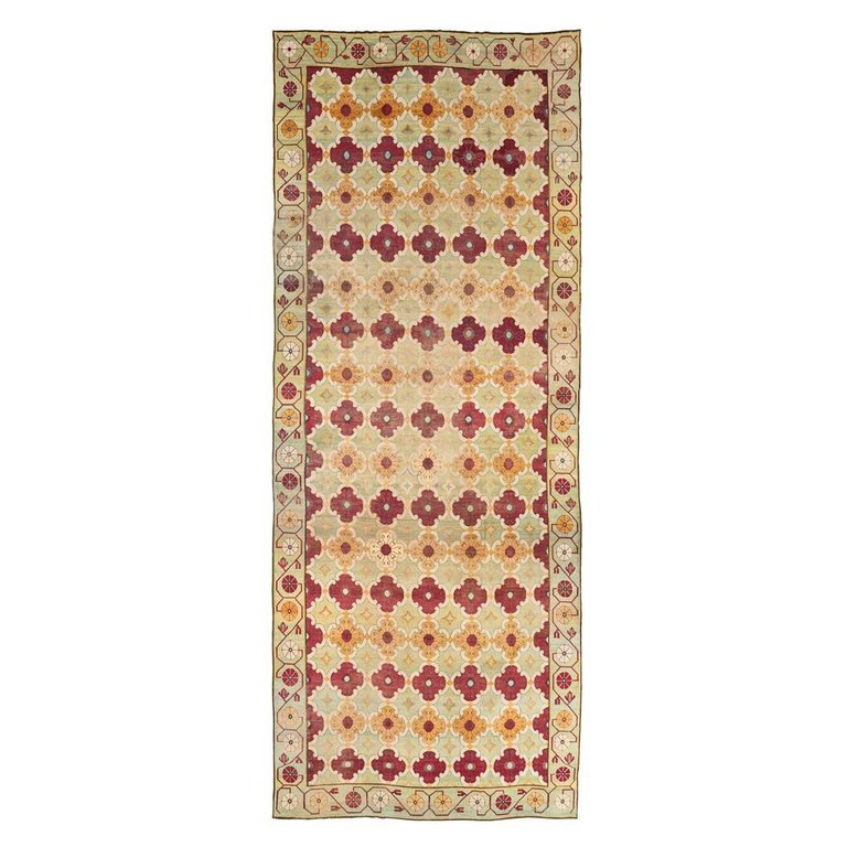 The second Lotto carpet in this auction also belonged to Martina Limburger von Hoffmann of Leipzig, and has been continuously owned by the family since the early 20th century at the latest. Martina Limburger von Hoffmann ran a large house, collected art and was in contact with the museum curators and antique dealers of the day. However, the surviving documents offer no information as to who bought this lottery and when this purchase was made. – On the red ground, golden yellow arabesques and geometrically stylized blossoms and leaves combine into the characteristic repeat of hermetically interlocked crosses and larger octagons. In this example it is drawn in the so-called kilim style. The main border design of cassettes enclosing diagonal crosses and linked by overlapping crosses placed between them is rather rare in Lotto carpets. A so-called Bellini niche and re-entrant carpet (see Eskenazi), which probably dates from the same period as our Lotto, shows an identical border. There are three further Lottos with this border: a larger carpet in the Bavarian National Museum, Munich, that is closely related to our Lotto in style; a Lotto published by Schürmann about the same size as our piece; and a Lotto of later date (17th century) formerly in the Bernheimer Collection. – Obvious signs of age and wear, low pile, old repairs. The yellow outer borders have been repiled on both sides, and there is one repiled stripe in the outer border at the top.