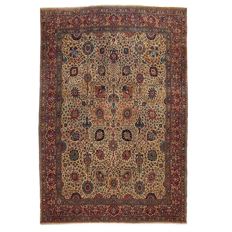 The Mashhad example would go on to be exhibited in the Burlington House exhibition in 1931 along with a select group of carpets and returned to the shrine at the close of the exhibition (Maktabi 2016, p.65). Maktabi notes that “Historically, the shrine has been off limits to non-Muslims and its treasures the stuff of legend described by those who had seen them first hand” (Maktabi 2016, p.59). The presence of this rare weave thus allows us a glimpse at its magnificent Safavid predecessor. Sotheby’s, Estimate